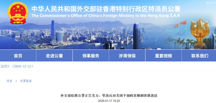 外交部驻港公署网站1月17日消息,针对美国个别政客再次推动有关涉港恶法,鼓噪取消香港驻美经贸办事处特权豁免待遇甚至关闭办事处,外交部驻港公署发言人表示强烈谴责和坚决反对,并强调指出: