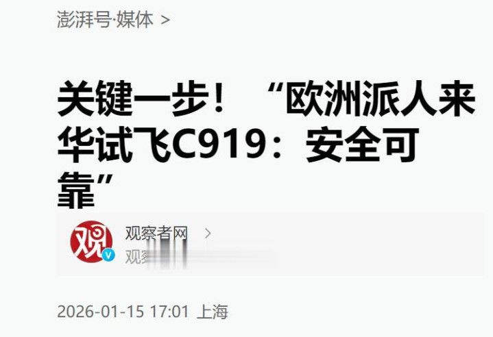 澎湃新闻:关键一步!“欧洲派人来华试飞C919:安全可靠”