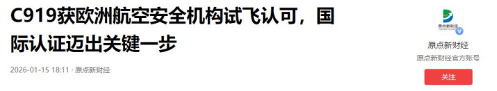 原点新财经:C919获欧洲航空安全机构试飞认可,国际认证迈出关键一步